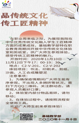 在职业周来临之际,为展现我院在中华优秀传统文化融入学生工匠精神方面的成果成效,基础教学部特在2020年11月10日——11月15日下午17点——19点半开放中华传统文化体验室和剪纸室,增设书法、印刷术、剪纸、沙画等体验项目,供广大师生参观体验,感受传统工匠精神的魅力。