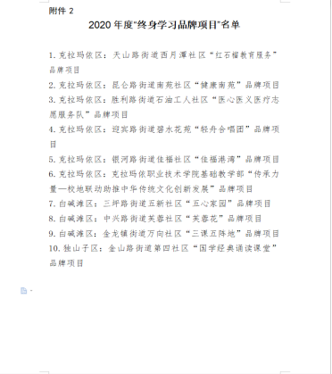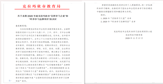根据《教育部职业教育与成人教育司关于征集“百姓学习之星”和“终身学习品牌项目”有关事宜的函》要求,全面贯彻落实习近平新时代中国特色社会主义思想和相关重要指示精神,我院基础教学部范瑜、杨龙、杜银萍、张培儒、王郡巍等教师结合公共课实际情况,建立了“传承力量——校地联动助推中华传统文化创新发展”项目。经过各位老师的精心准备,不断完善创新,该项目于2020年年底被评为克拉玛依市“终身学习品牌项目”。